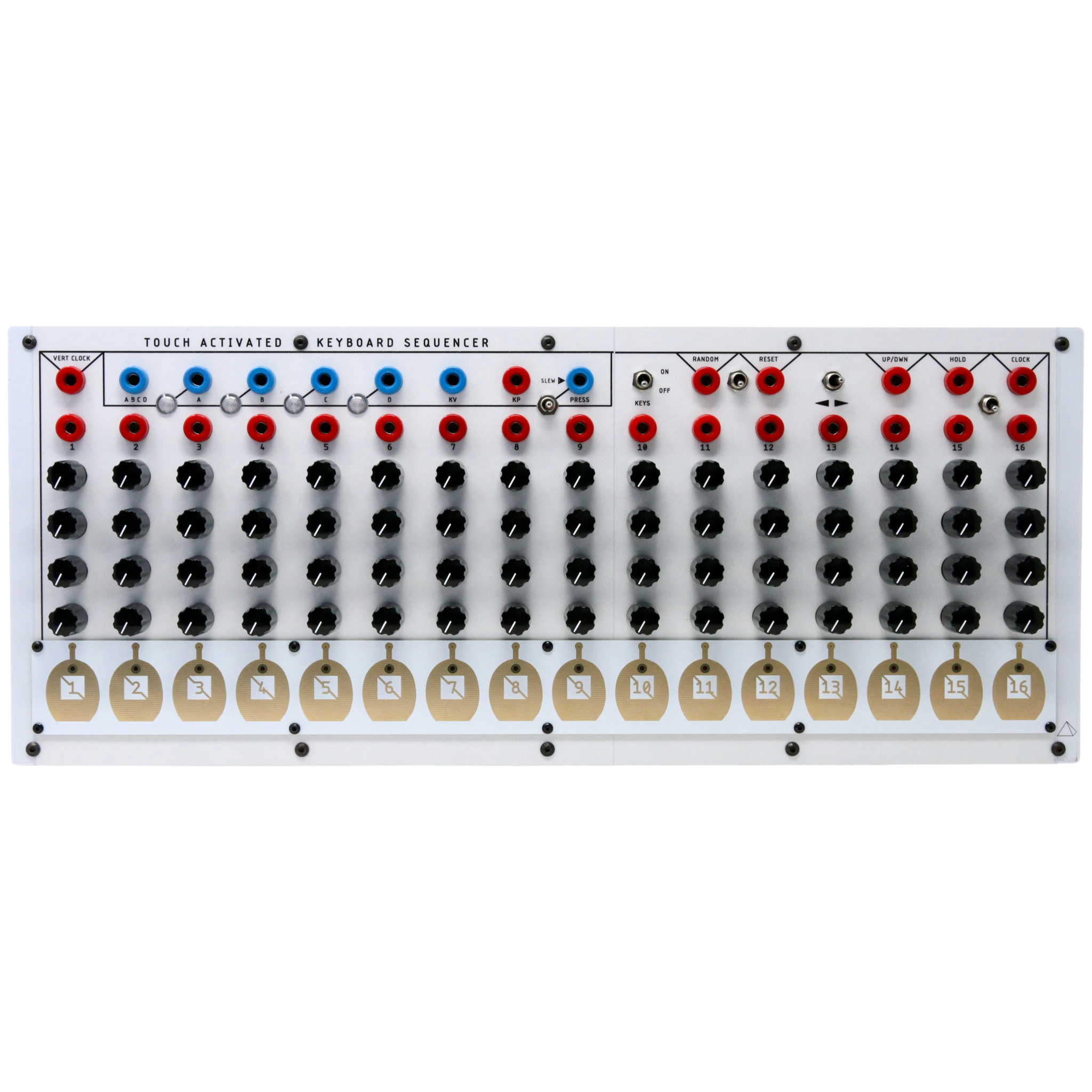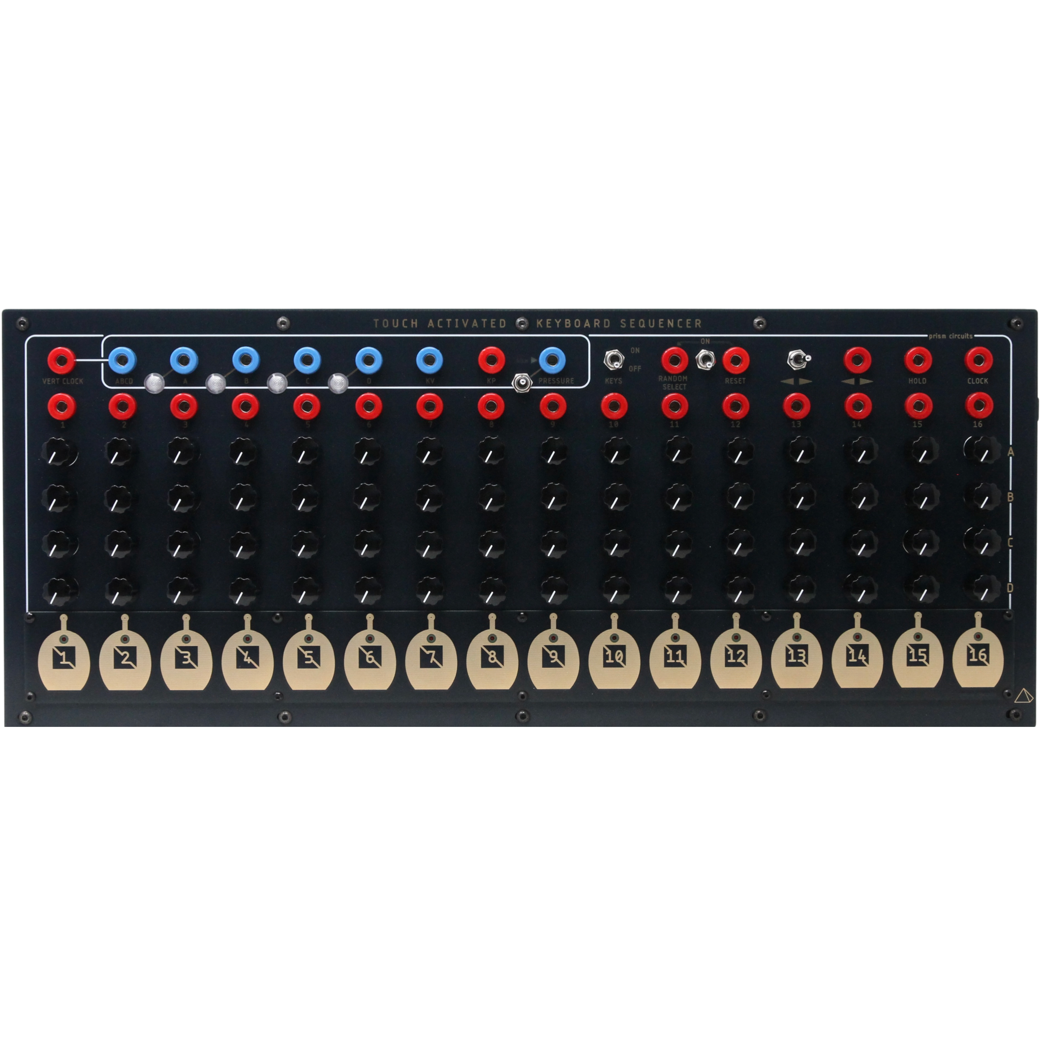 The Prism Circuits TKB (Touch-Activated Keyboard Sequencer) is a 16-stage, four-row control voltage and pulse generator built around capacitive touch sensing. Each stage provides independent CV and gate outputs, enabling complex sequencing, manual step addressing, transposition, and real-time performance control. Originally designed by Serge Tcherepnin in the 1970s, the TKB is prized for its immediacy, flexibility, and deep integration with modular patch-programming systems—making it a powerful centerpiece for expressive, hands-on synthesis.
